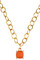 RAMINA - en fantastisk halskæde hvor det markante vedhæng udgøres af en iøjenfaldende cabochon slebet sten flankeret af fire mindre kontrastfarvede krystaller. Kæden er designet i poleret stål, vehænget i messing og er ca 45 cm, dertil læg en forlængerkæde på 5 cm. Vedhænget måler ca 18 mm i diameter. Her vist i sæsonens smukke koral rosa på guldtonet kæde. Dansk Design og super glamurøs.